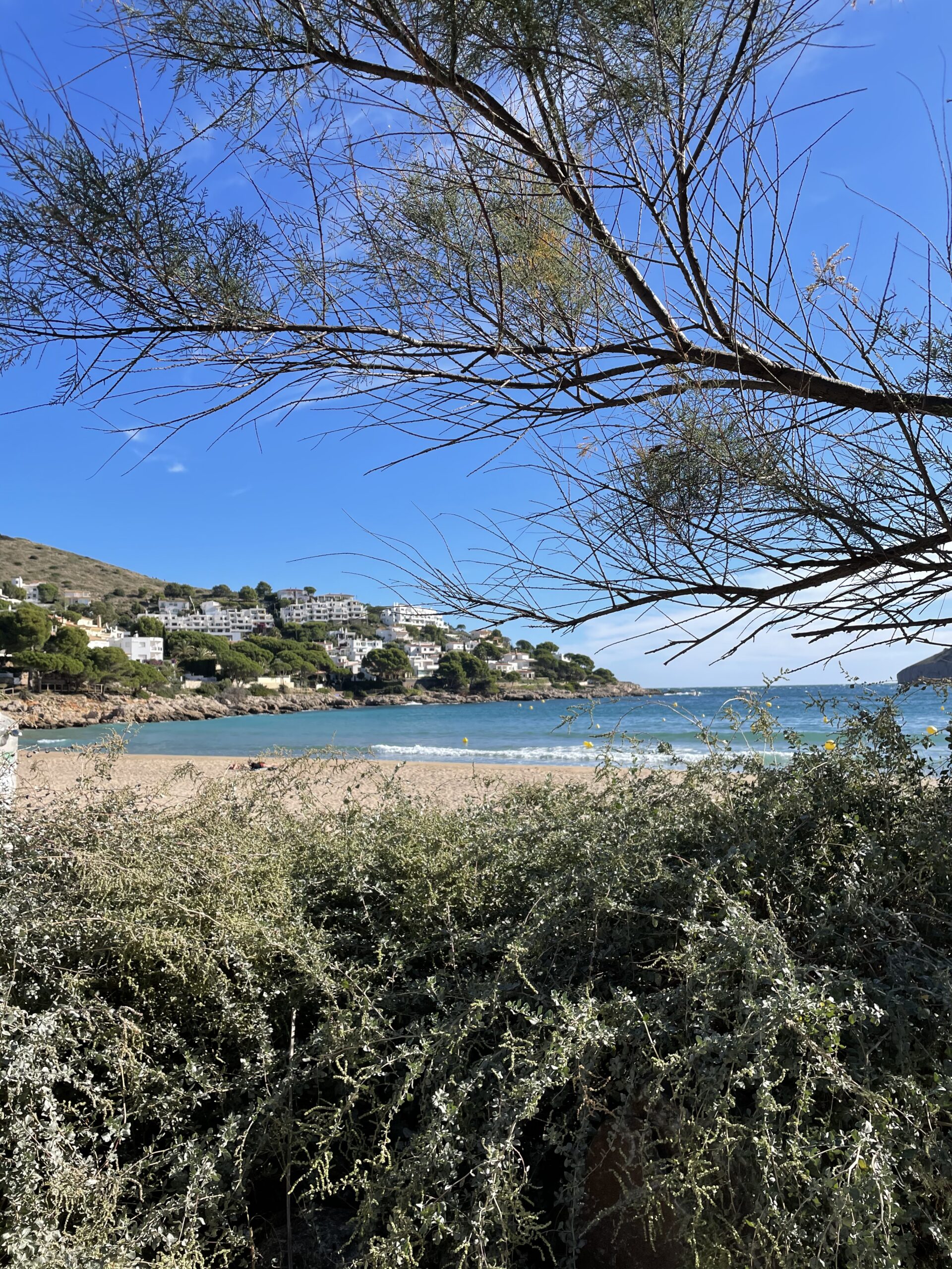 Après la Punta del Milà, le sentier descend et traverse une longue plaine plate qui longe le littoral pendant plusieurs kilomètres — un changement de rythme bienvenu après la montée. Le paysage se fait plus sec, plus aride, avec des zones de garrigue et des vues dégagées sur le massif du Montgrí qui se rapproche à vue d’œil. C’est à ce moment qu’on comprend ce qui nous attend pour la fin de journée.